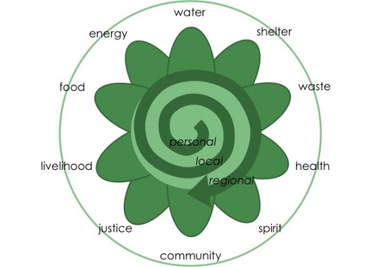 First, what are human needs? The version of the permaculture flower that I work with names some important ones: food, shelter, water, waste recycling, energy, community, health, spiritual fulfillment, justice, and livelihood. The task set out by permaculture, in the new paradigm, is to meet those needs while preserving ecosystem health, and we have metrics for assessing the latter. The way those needs are met will vary by place and culture, but the metrics of ecosystem health can be applied fairly universally.