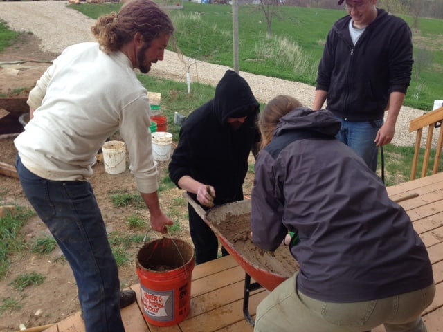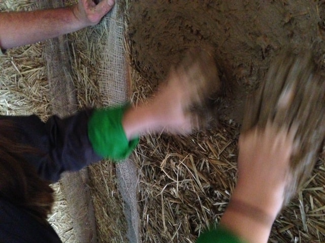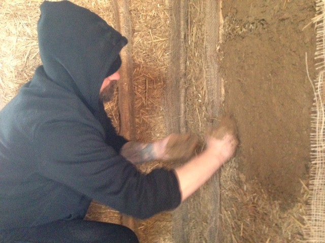 Finally warm enough to finish up the straw cabin here at Kinstone that we built last season. We tested out six different mixes of straw, clay and sand yesterday and the students got their hands in the mud…