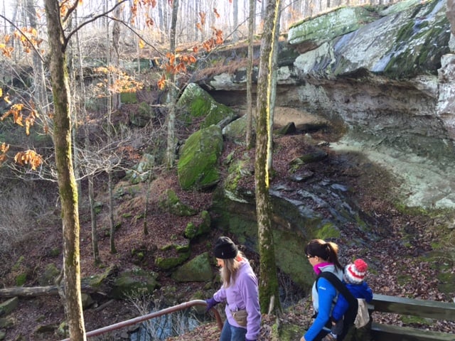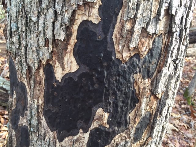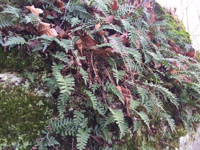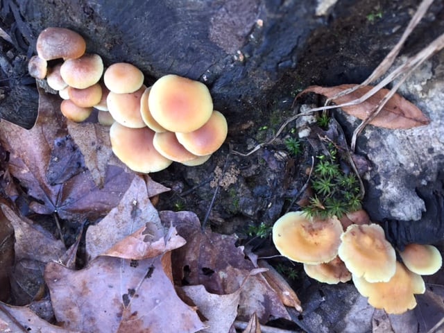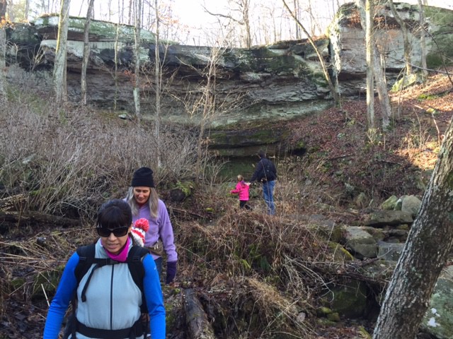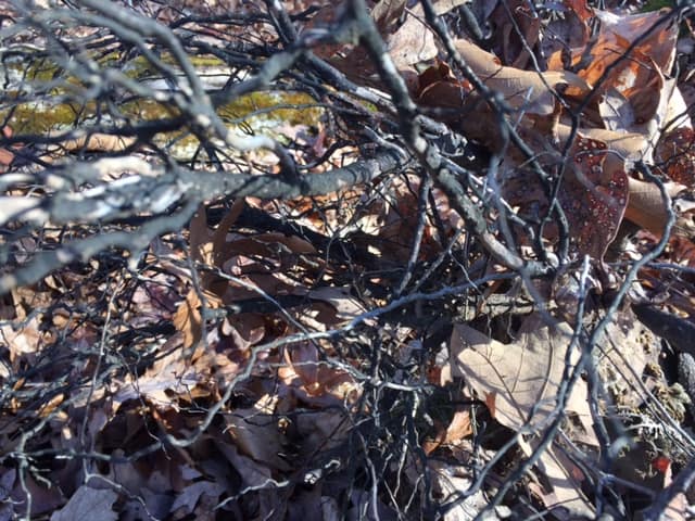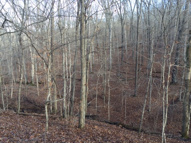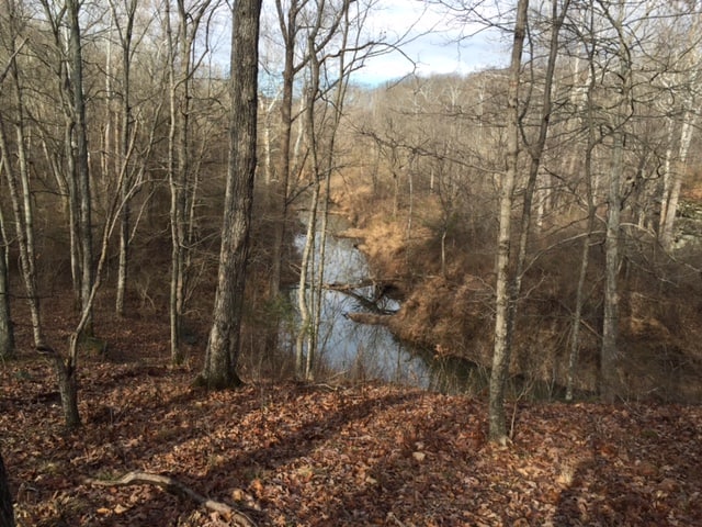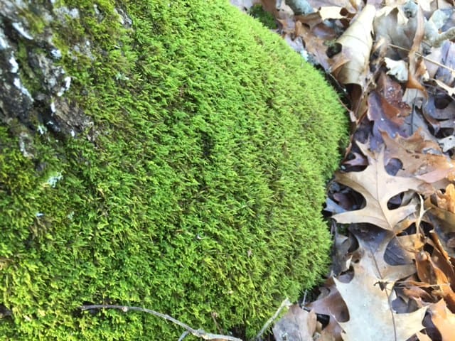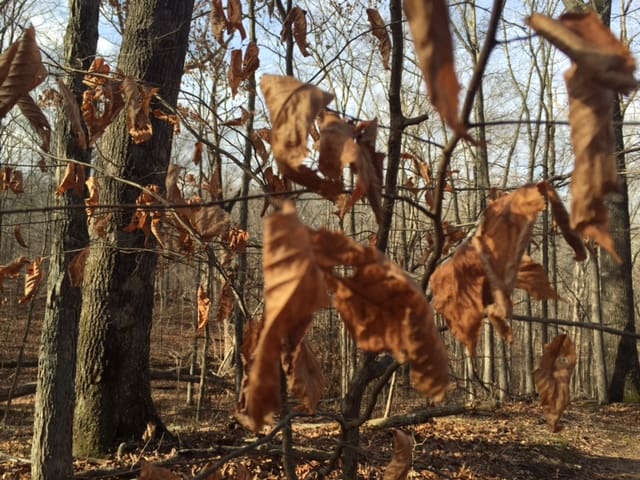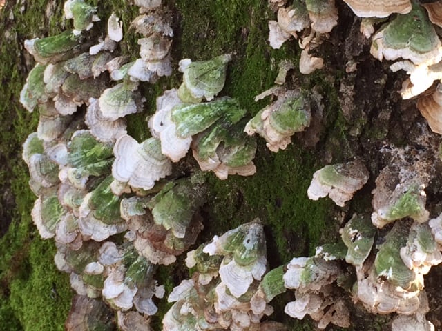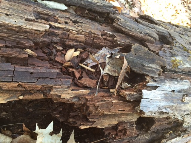 There are big wooden bones here, strewn about and about, broken stumps and subtle nuances of color. Some may call this winter drab, but the scatters of trees and fruiting bodies of fungus, mossy cushions, ferns and the green leaves of the honeysuckle vine tell us that winter does not necessarily mean the death of things. Mycelia secretly spread beneath layers of oak, tulip poplar and hickory leaves creating a duff that feels like a trampoline beneath the foot. Redheaded woodpeckers trip a beat that echoes concentric rings, scenting and saturating the forest with native rhythms as larva and sleeping beetles are sucked up and ground down by gizzard: food for forest creatures. Yes, it comes round again. Spring veiled by the subtle browns, grays, pastel greens of winter, and the sky like blue crystals, a stage for swift cirrus clouds racing by…