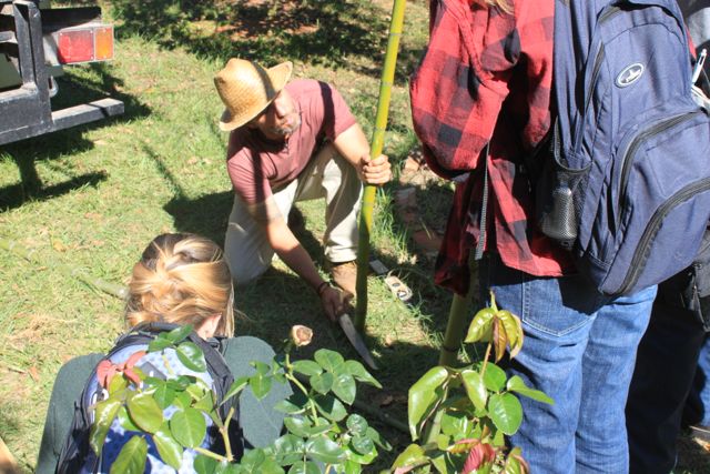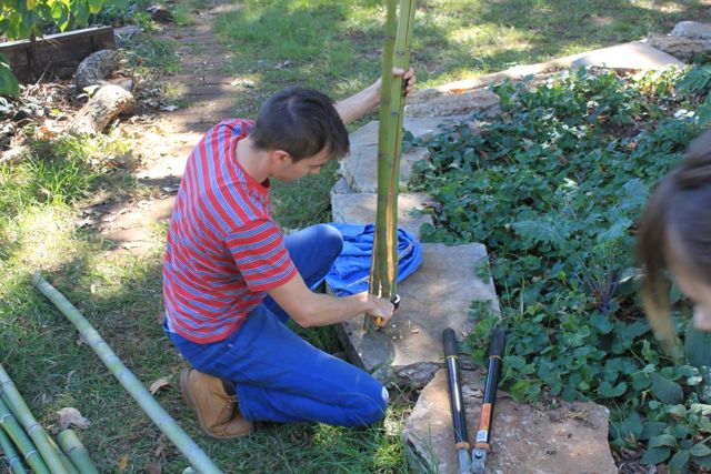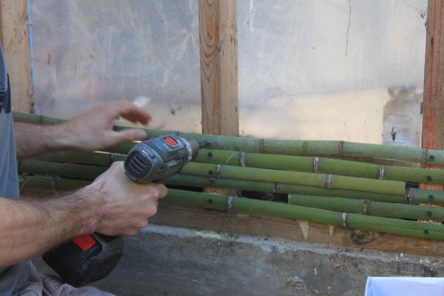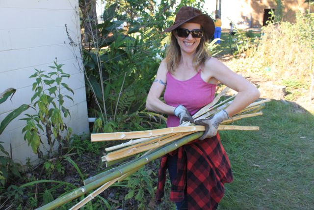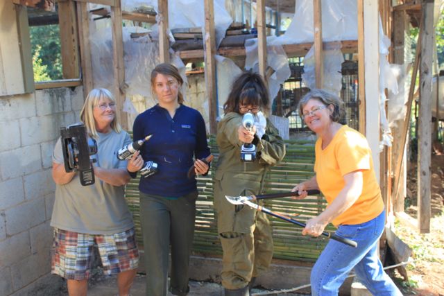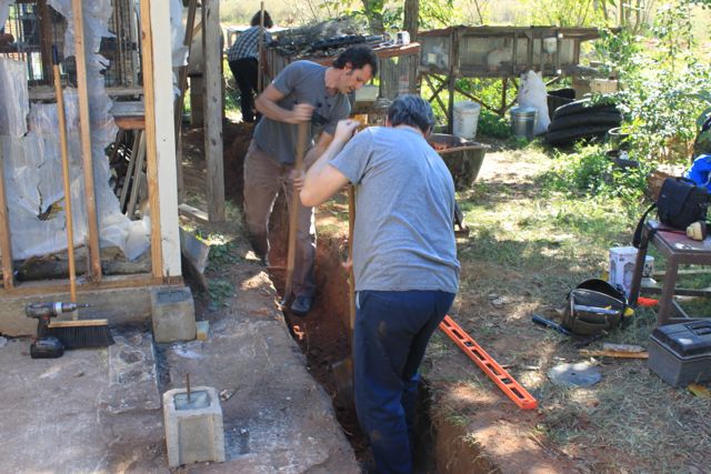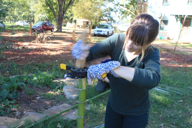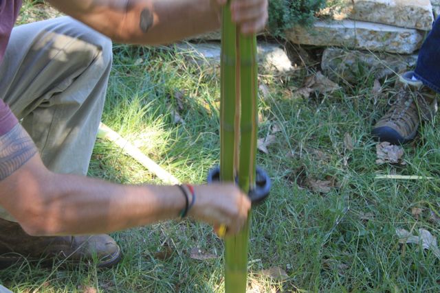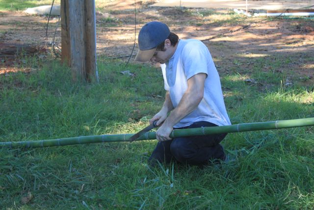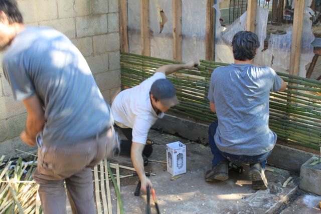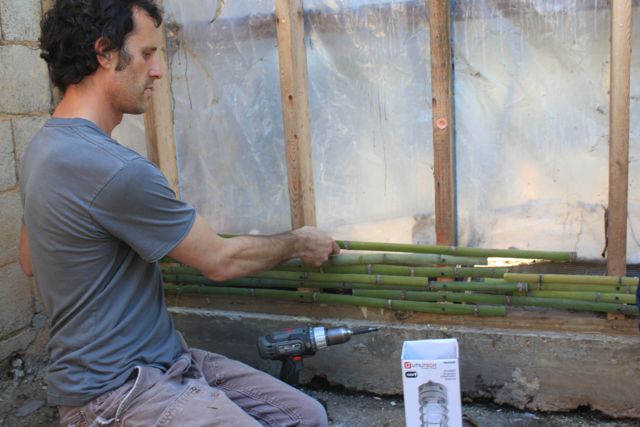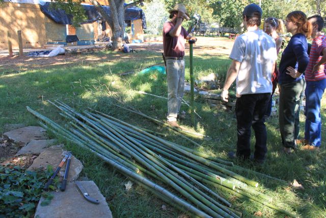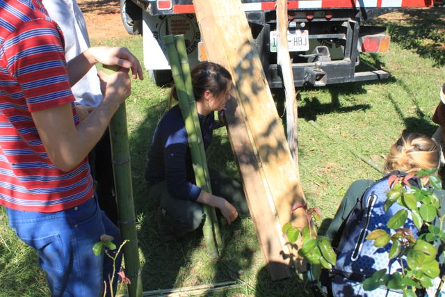 This morning, after lectures on ecological building modalities Cliff Davis, myself, and the students headed out to the site which will become a hybrid, straw-clay, earth-bag, cob building. We will also be constructing a cob oven. After completing our PDC 2011 yesterday we started at 8:30 AM on our next adventure. Most of the initial prep work is complete. Tomorrow we lay in the gravel and tile for the rubble trench footing, stuff earth-bags for the stem wall, complete installing posts, screwing in bamboo, and mixing cob. There is a bit of wiring and framing to complete. This building will include a humanure toilet and storage for tools. Will keep you up to date on our progress.