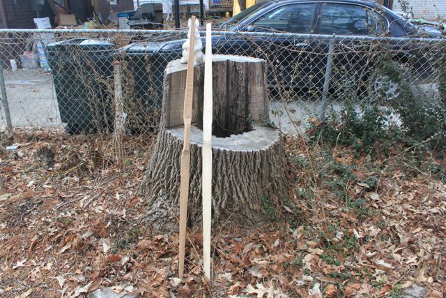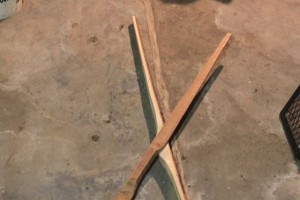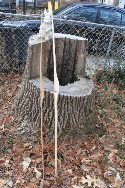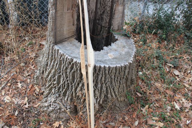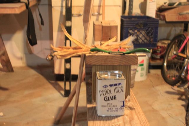 Here are some pictures of the two bows that I am making, one oak and one shagbark hickory. I will be backing the oak bow with sinew which comes from near the spine of a deer. This will give the bow more strength and will help keep the bow from following the string. When bent the bow has a tendency to stay bent in the direction of the pull. By backing the bow with sinew it will help to prevent this. I love making this stuff in the Burbs!