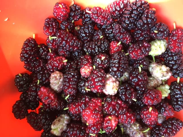 The mulberries have come and gone this year, but the memory of these delicacies of the plant world is still vivid within. I cannot imagine a summer without mulberries. Here in the neighborhood they are superabundant! I have the fondest memory of riding bicycles around town with my daughter and stopping at every mulberry tree and ingesting one of the sweetest and most delectable fruits in the plant kingdom. Highly perishable, mulberries are best eaten fresh off the branch, but if you get them home immediately they are excellent for drying, jellies, jams, pies, juices, smoothies, the list goes on. They will last maybe three days in the refrigerator, but will soon turn to a mass of mulberry sludge.