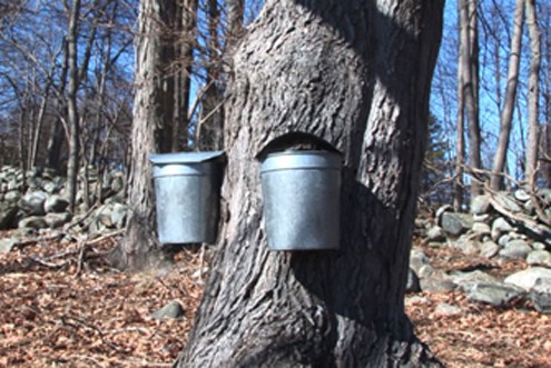I have eaten maple flower blossoms in the spring as a trailside nibble, but the most well know food extracted from maples is maple syrup. Although thirty to forty gallons of sap is required to produce one quart of syrup, it is well worth the effort. From January to April spiles (tubes) are inserted into the tree, with bucket beneath, and the raw sap is collected. It is boiled to a thick consistency and readied for the breakfast table.