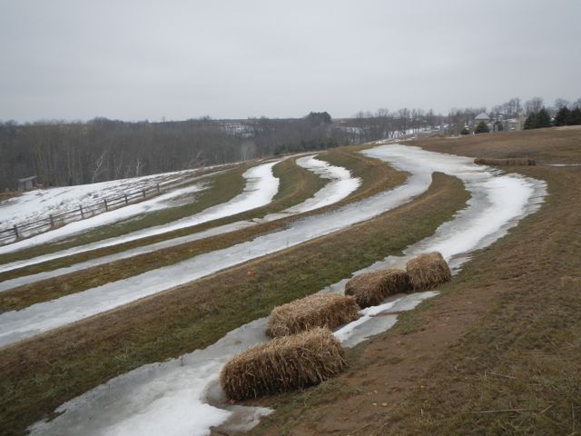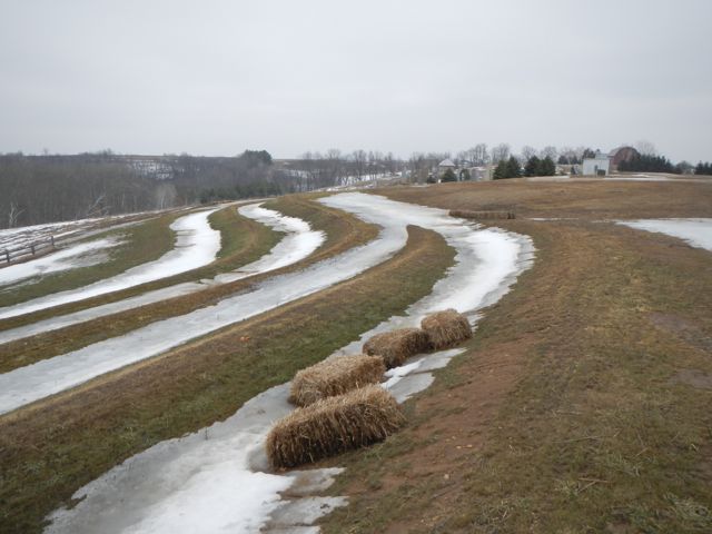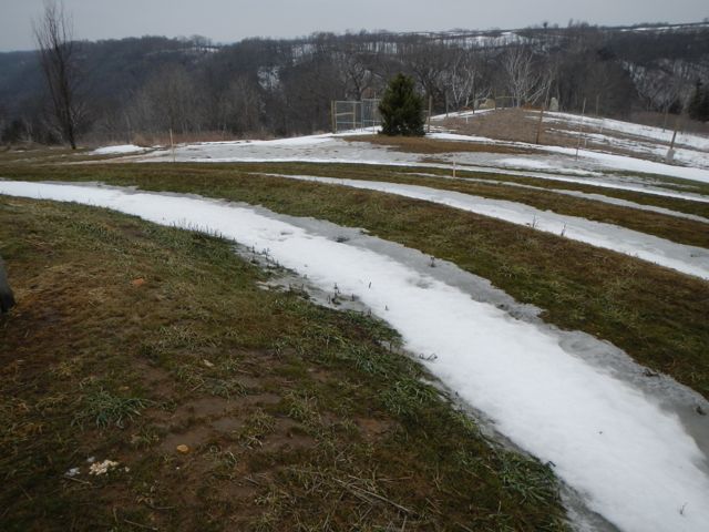 Just arrived at Kinstone and walked out to the terraces that we put in last year. They are doing their job wonderfully! Holding water (ice and snow). We configured these terraces with a slight backslope, and as you can see they are holding water for the plants that we will begin inserting in 2013.